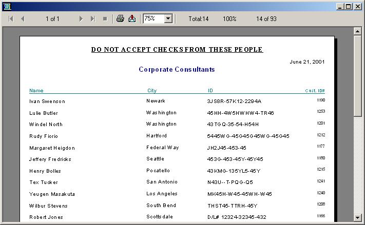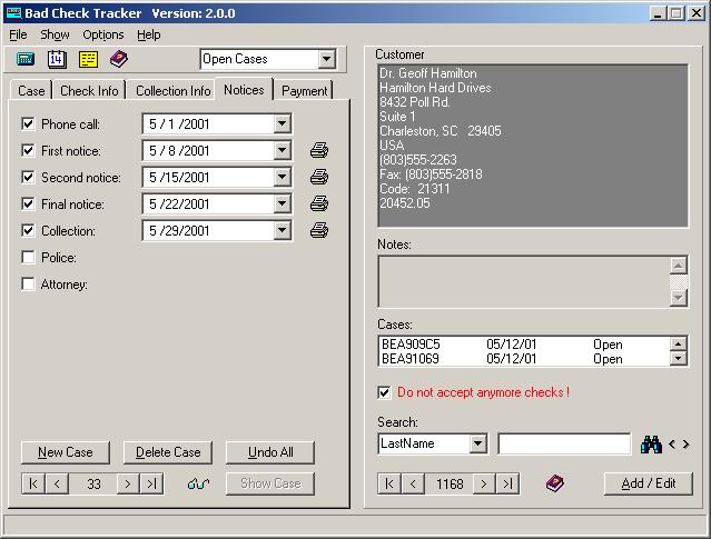 These are a few screen shots of some of the key components of Bad Check Tracker. Click on the images to enlarge them.